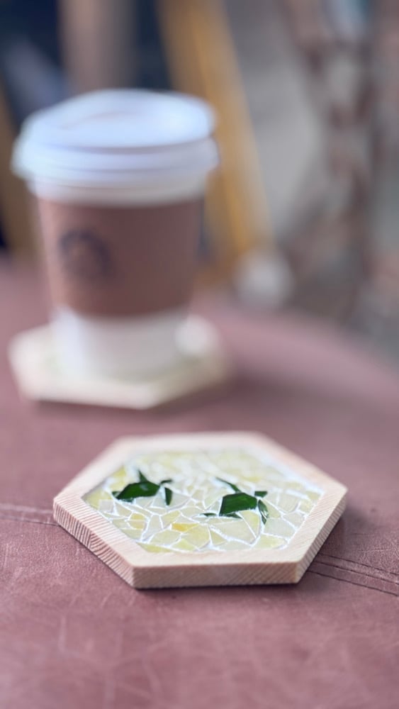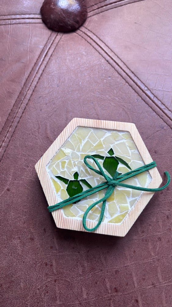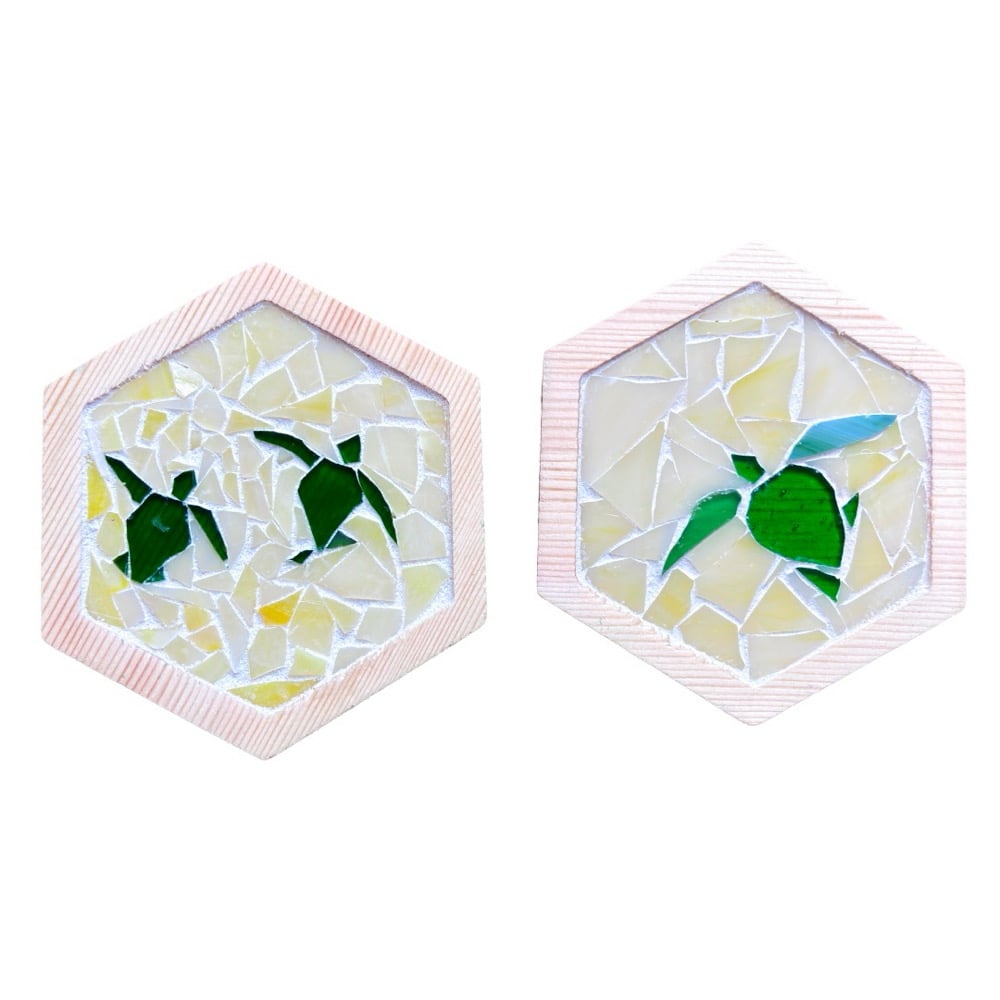A set of two stained glasss mosaic coasters with turtles. Pinewood hexagon base, 4 inch in diameter.