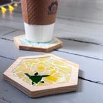 4-inch stained glass mosaic coasters with baby turtle design, hexagon shape, pinewood. Sold as a set of two - one in yellow background (Sand) and one with blue (Water).