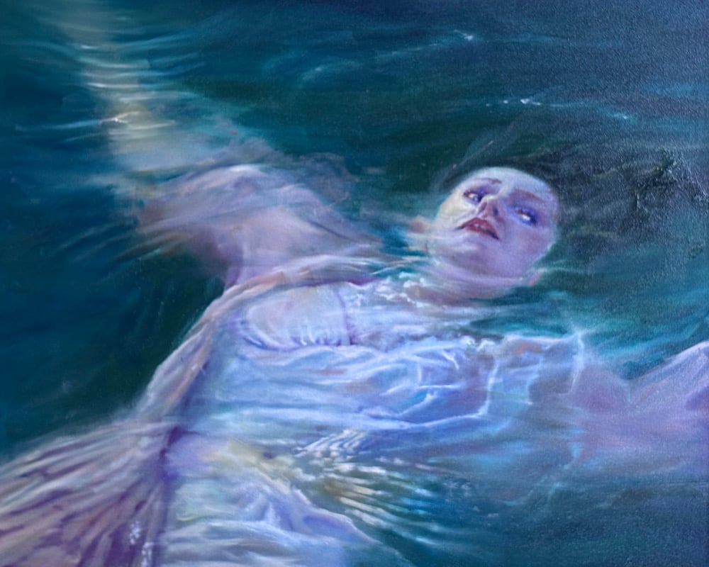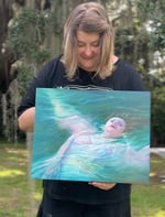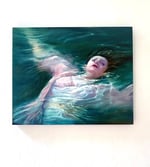 A haunting, tender moment suspended in motion — Surrender to Tide captures a woman adrift in water, her face caught between resistance and release. Layers of translucent fabric swirl around her as the current blurs the line between body and sea. This oil painting explores themes of softness, surrender, and emotional rebirth.
